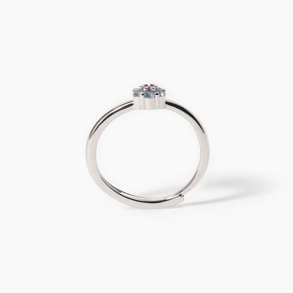 Anello in argento con zirconi azzurri e rubino sintetico disposti a forma di fiore.