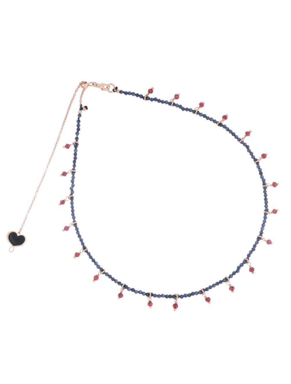 Girocollo chocker con pietre di Zaffiro e gocce di Granato pendenti realizzato in argento 925 con galvanica oro rosa ad alto spessore e resistenza.
