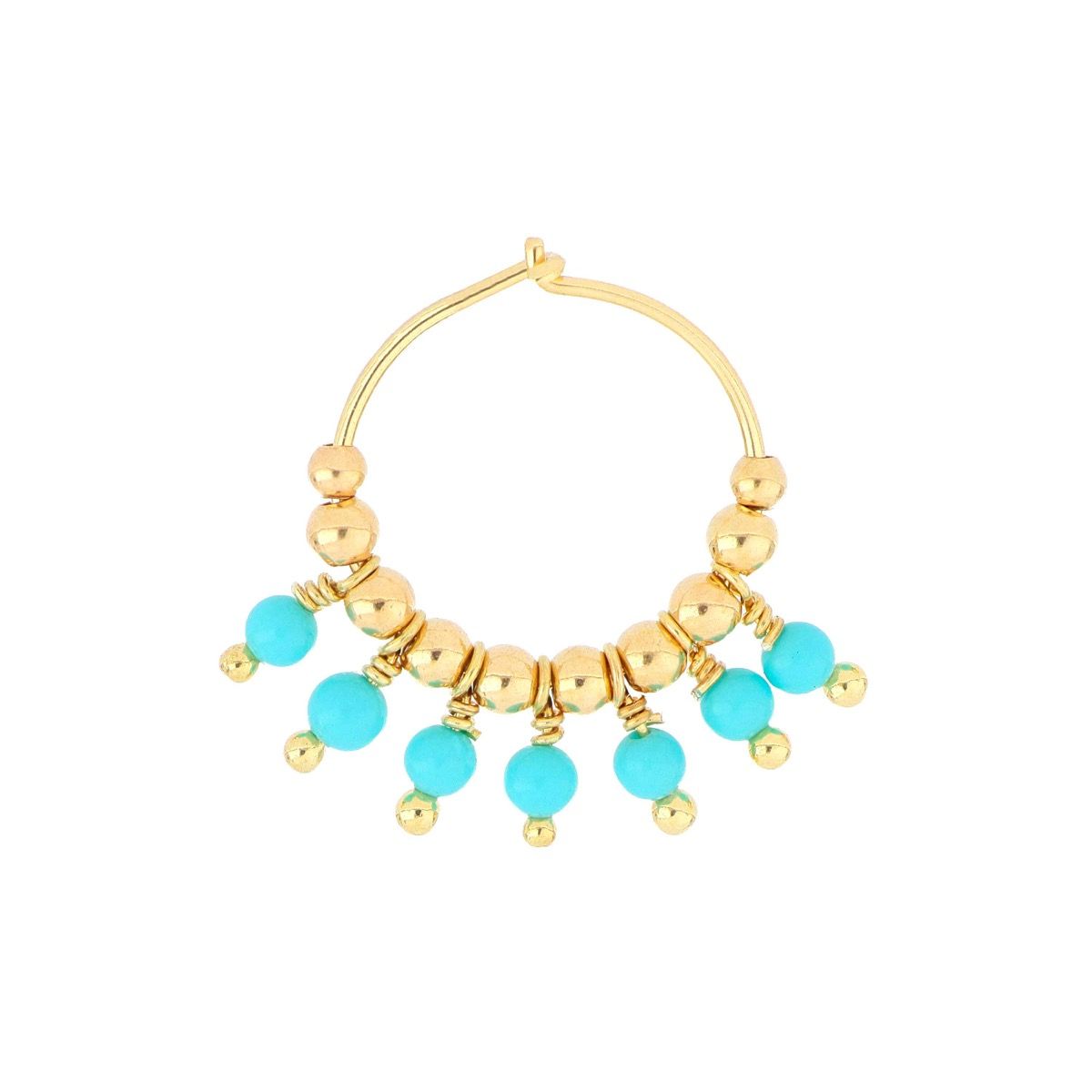 Orecchino a cerchio singolo con pietre di pasta di turchese pendenti e sfere decorative in argento.