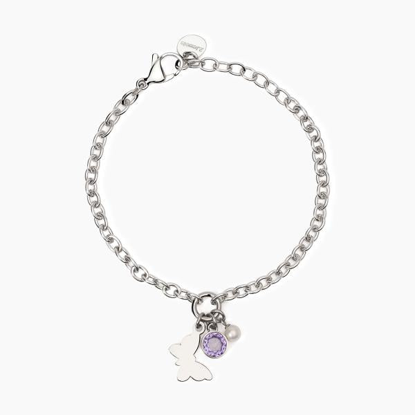 Bracciale in acciaio 316L con catena forzatina 4 mm e ciondoli farfalla 15x10 mm, zircone viola Ø 6 mm e perla conchiglia Ø 4 mm, lunghezza regolabile da 16 a 19 cm