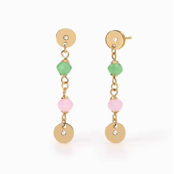 Orecchini in acciaio 316L e PVD giallo con elementi Ø 8 mm e glass multicolor faccettato Ø 6 mm, lunghezza totale orecchino 5 cm