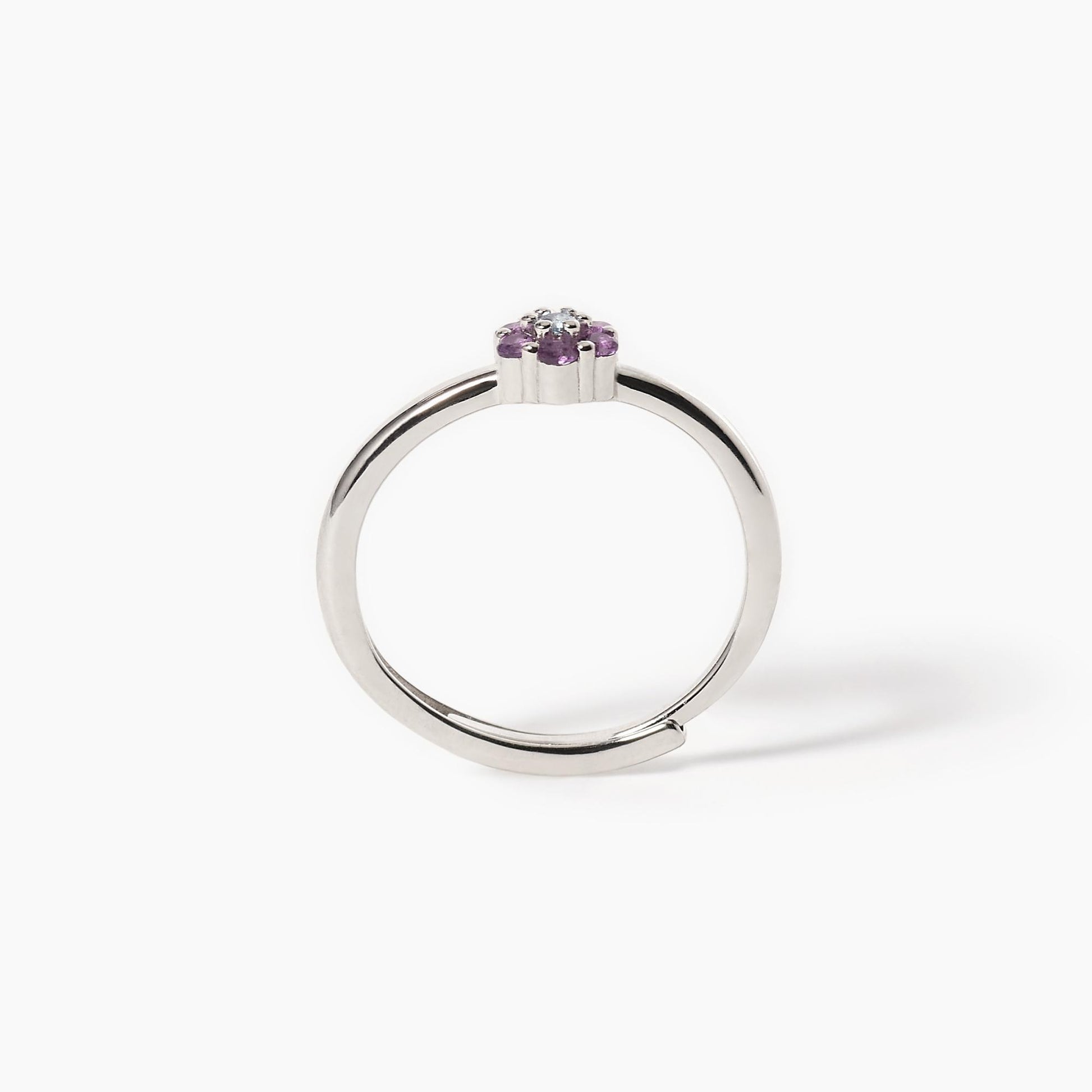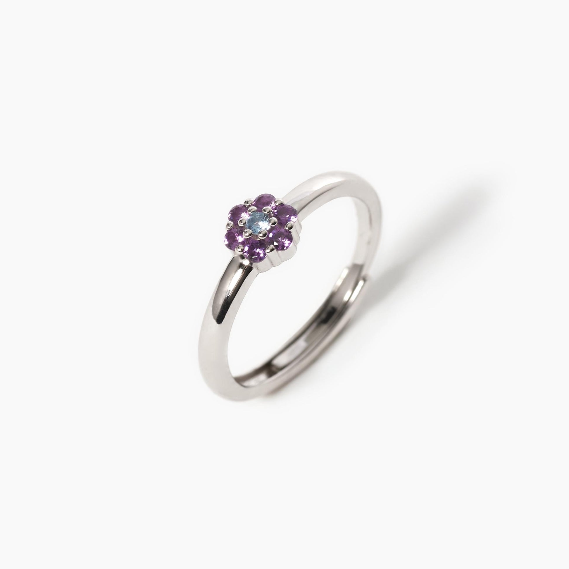 Anello in argento con zirconi azzurri e viola disposti a forma di fiore.