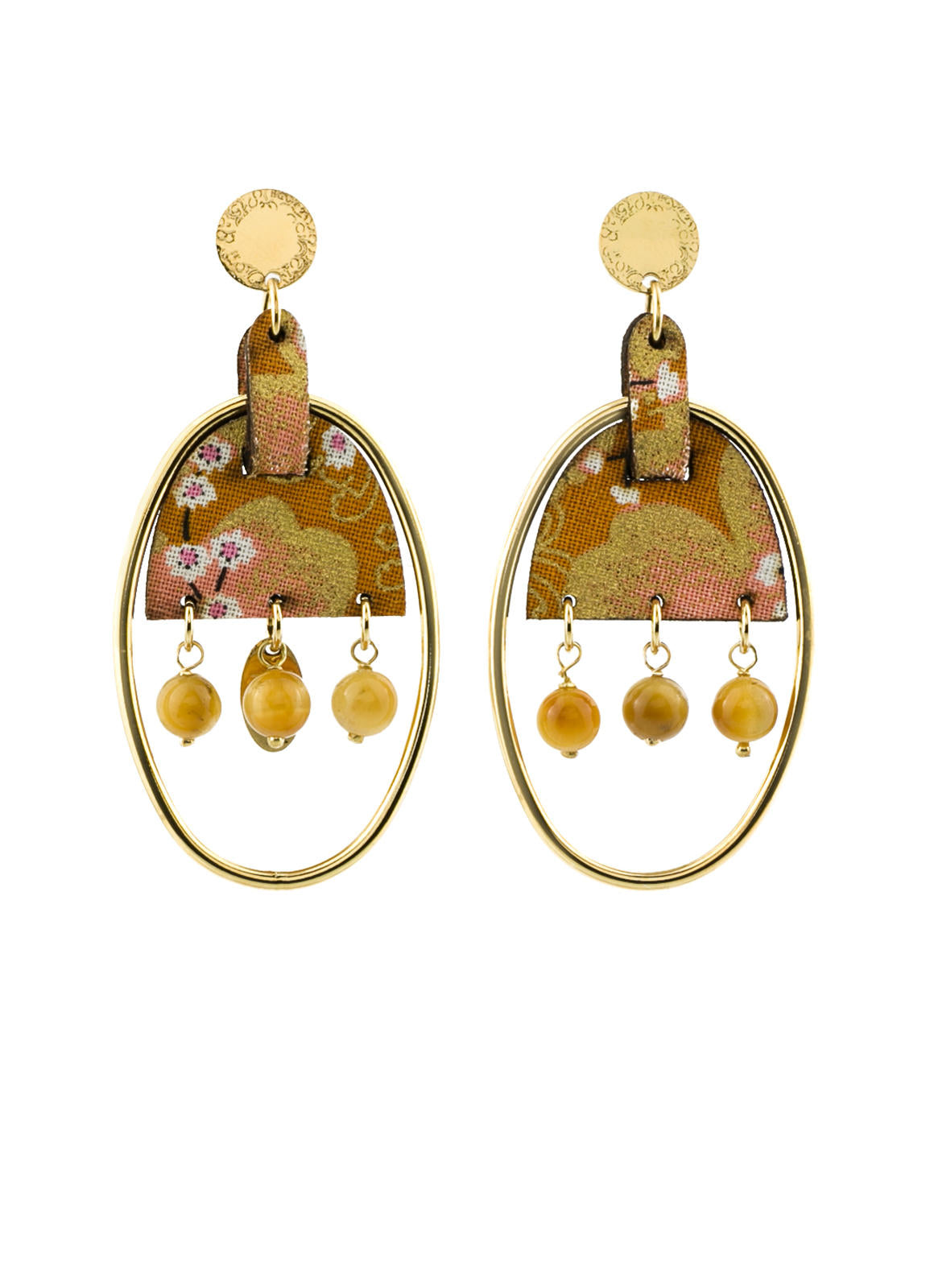 Orecchini realizzati con sete di kimono antichi giapponesi stesi su pelle. Elementi in ottone galvanizzato oro. Lunghezza orecchino 6,5 cm. Diametro 2 cm. Chiusura perno e farfalla. Made in Italy