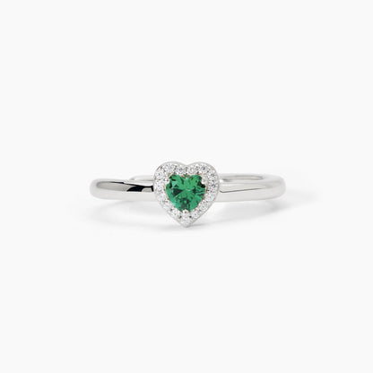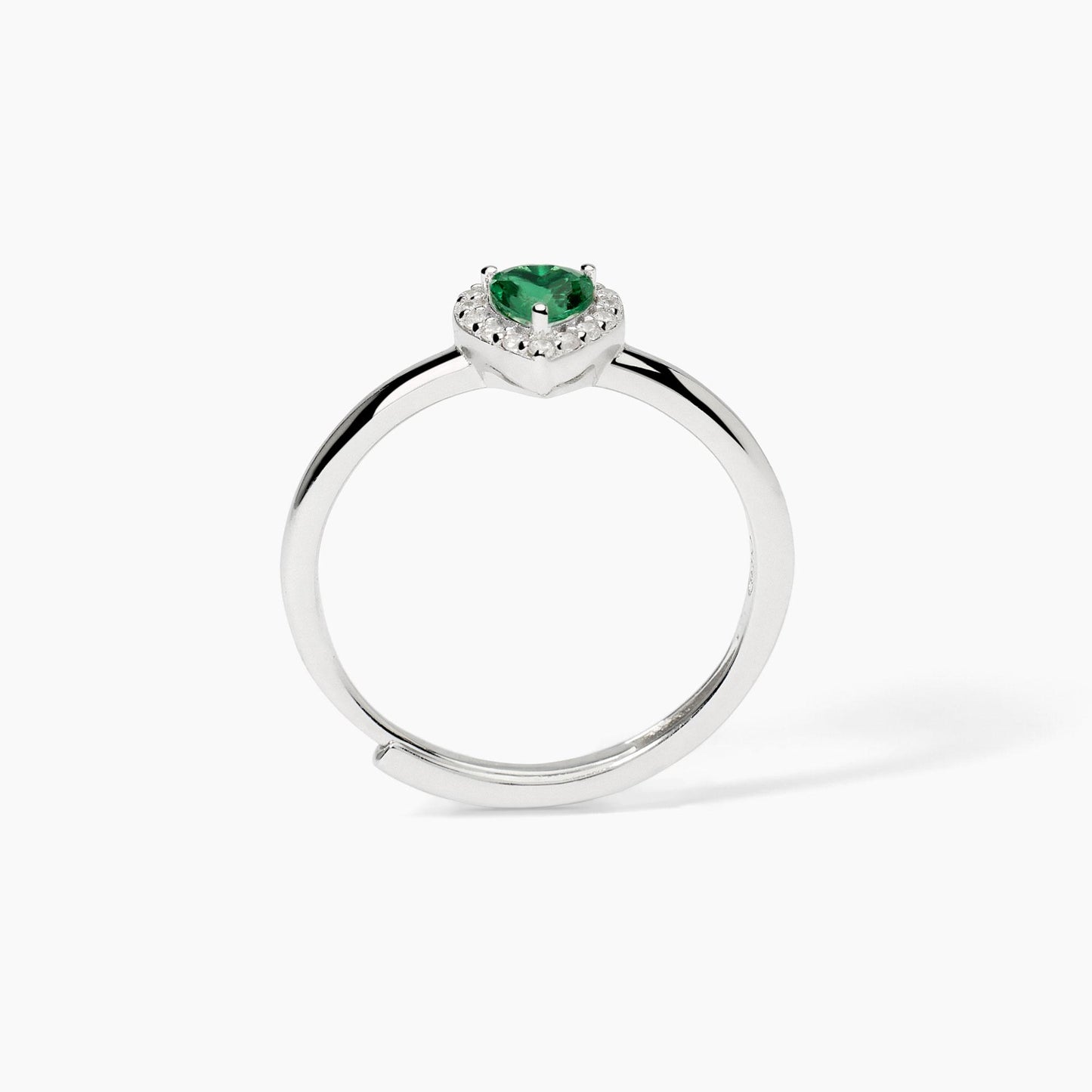 Anello da donna regolabile in argento rodiato con smeraldo sintetico taglio cuore e zirconi bianchi.