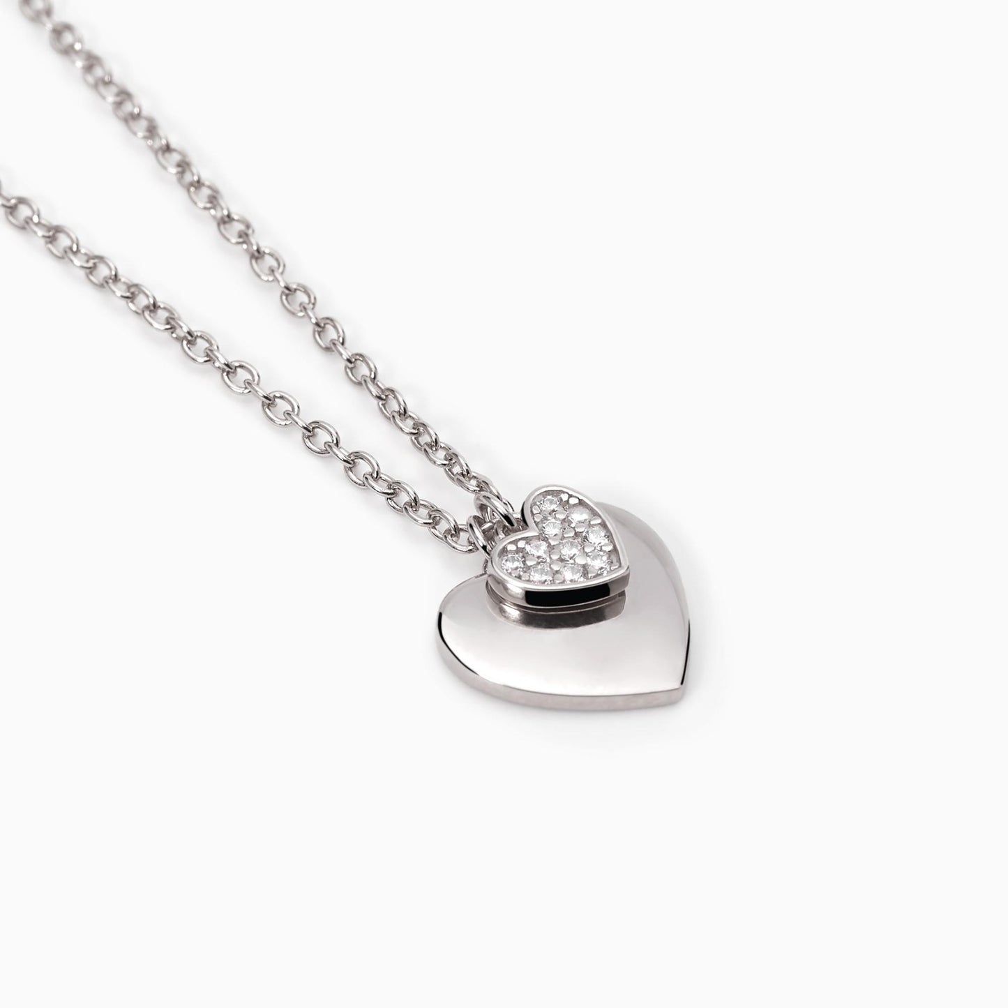Girocollo in argento con catena forzatina. Il ciondolo principale può essere personalizzato attraverso l'incisione di date, iniziali o nomi mentre il cuore pavè conferisce lumonisità al gioiello.