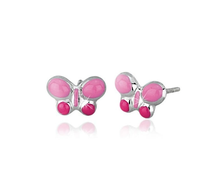 Orecchini a lobo realizzati in Argento 925 con farfalla smaltata rosa.