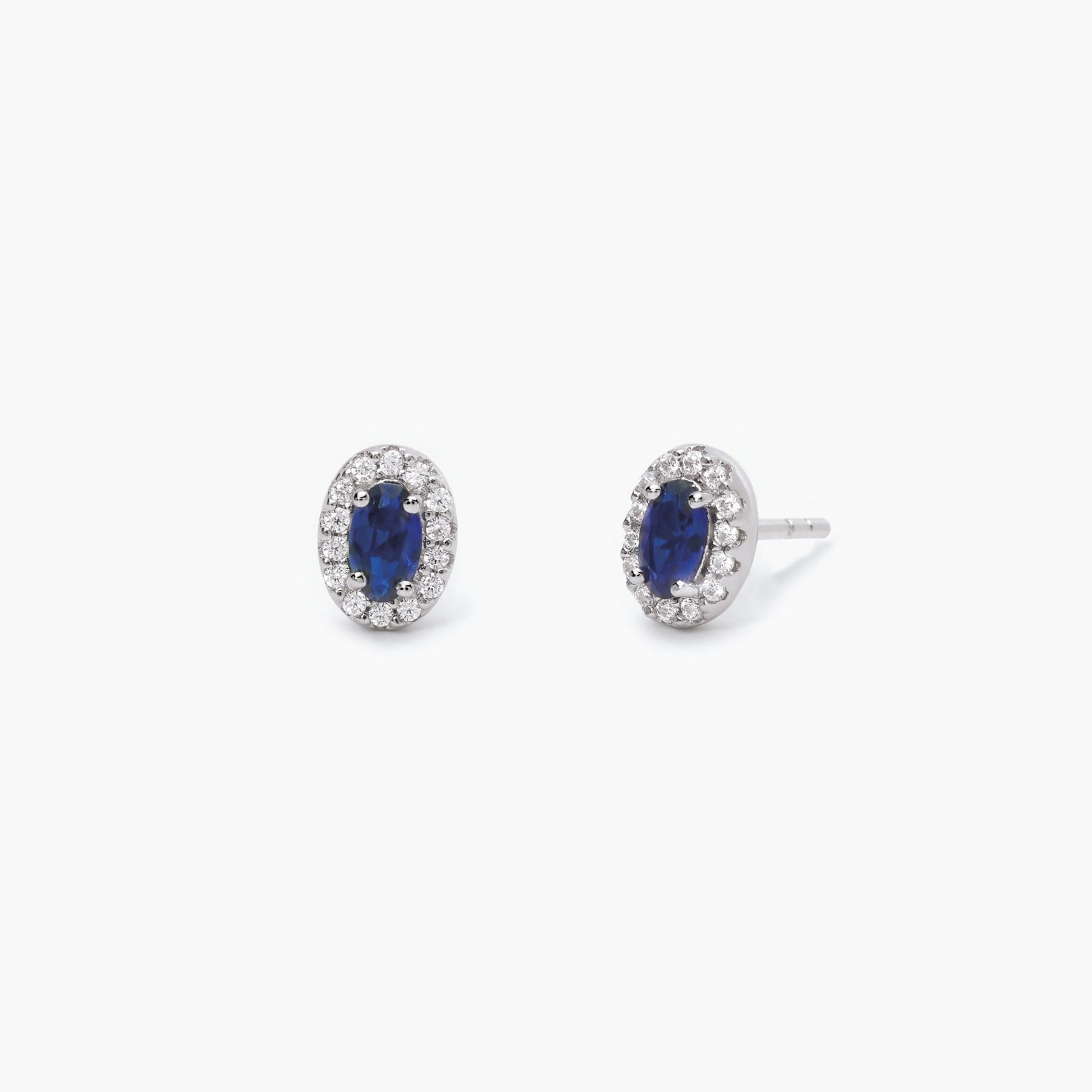 Orecchini a lobo in argento con zaffiri sintetici taglio ovale circondati da zirconi bianchi.