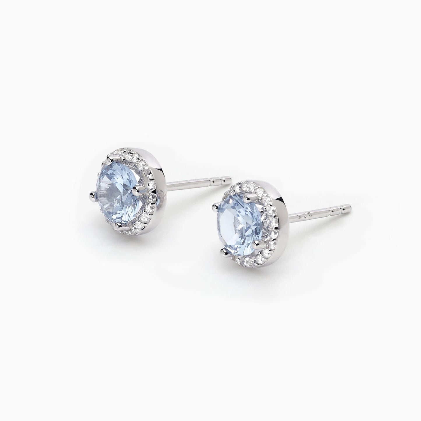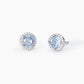 Orecchini da donna in argento rodiato a lobo con acquamarina sintetica circondata da zirconi bianchi.