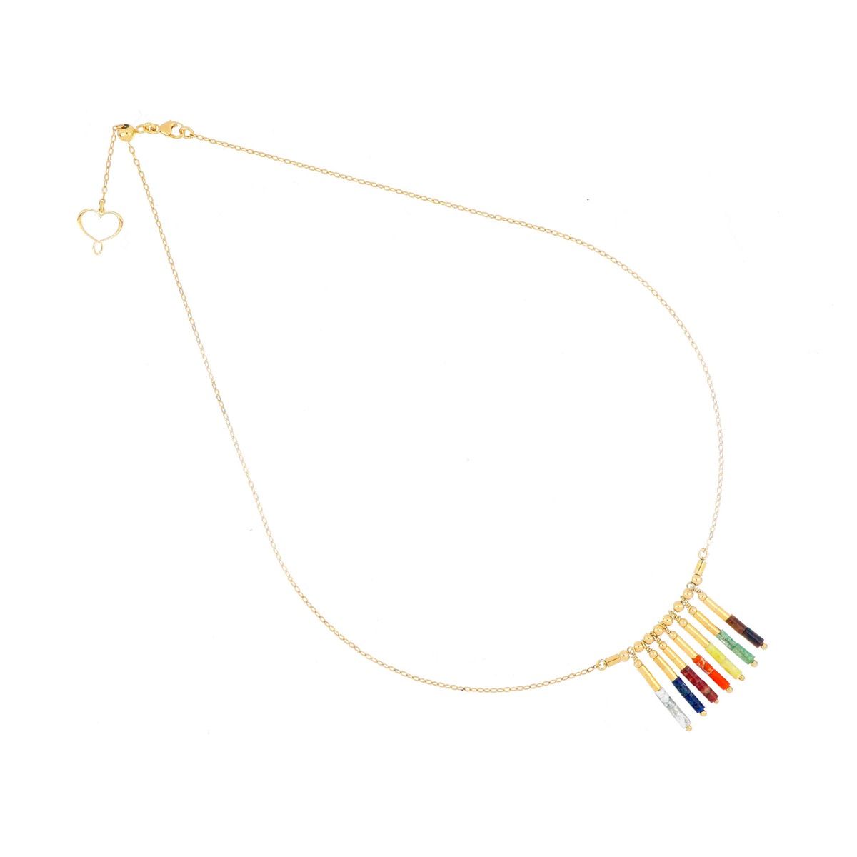 Il Girocollo presenta sette elementi pendenti di diverse pietre in varie colorazioni, sfere e tubini in argento.