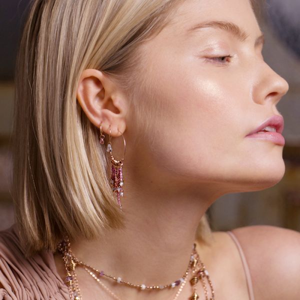 Il cerchio ha un diametro di 25 mm e presenta una cascata di pietre di Tormalina rosa e Acquamarina azzurra oltre a sfere decorative.
