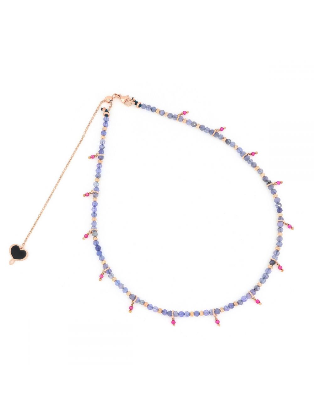 Girocollo chocker azzurro con pietre di Tanzanite e gocce di Rubellite rosa pendenti realizzato in argento 925 con galvanica oro rosa ad alto spessore e resistenza.