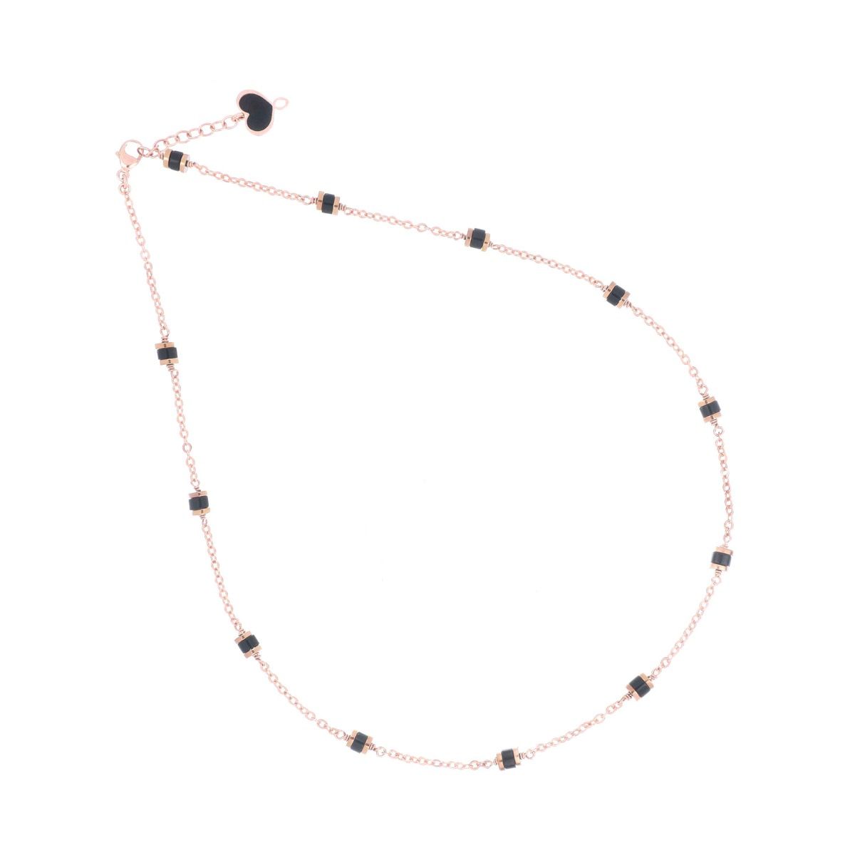 Girocollo realizzato in argento 925 con galvanica oro rosa ad alto spessore e resistenza catena e pietre di Agata nera tra dischetti di ematite.