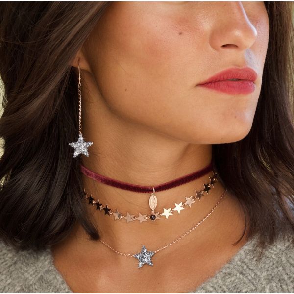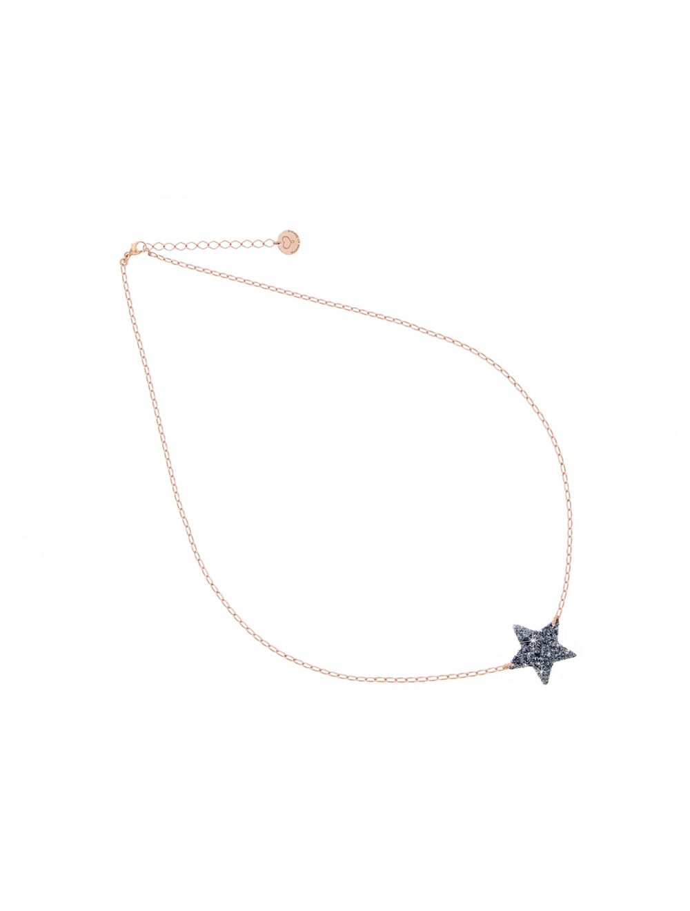 Collana girocollo realizzata con catena di argento 925 placcato in oro rosa ad alto spessore ed alta resistenza. La stella in glitter grigio misura 15 mm.