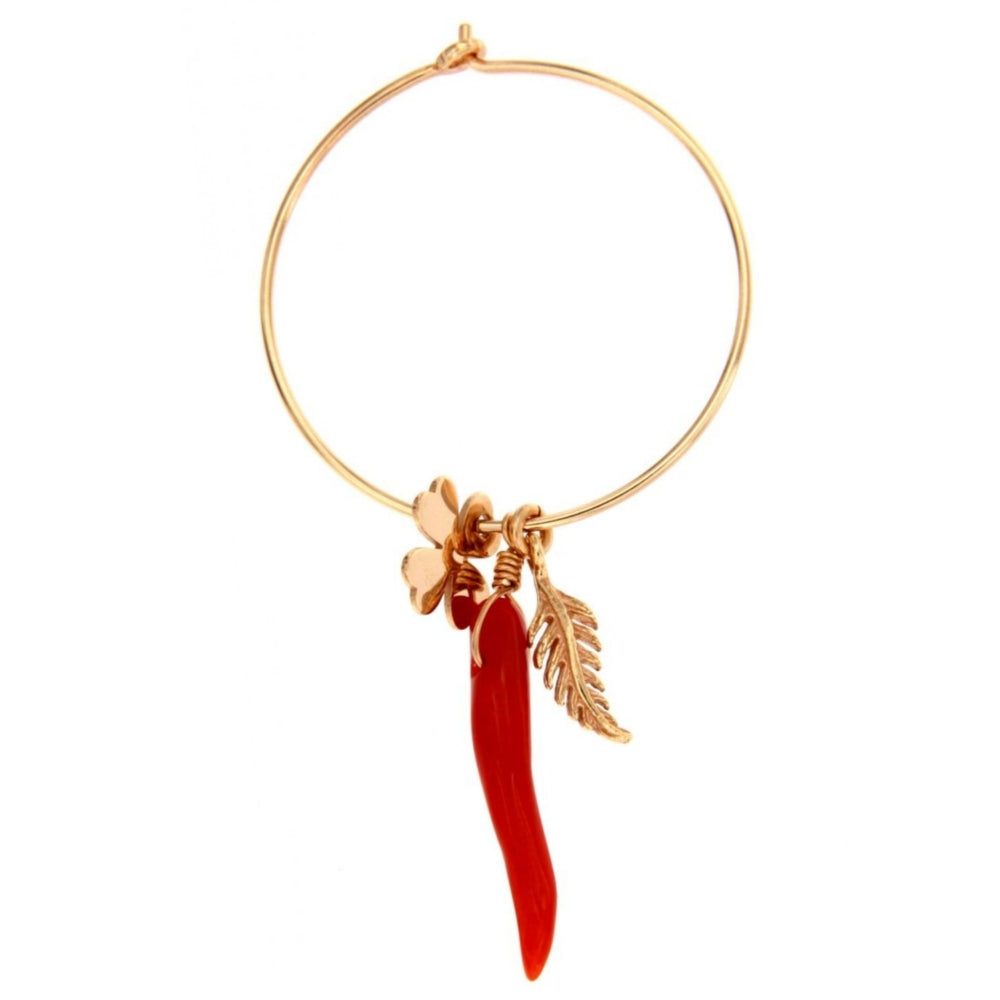 Orecchino a cerchio singolo con elementi pendenti. Gli elementi sono: un corno in corallo, una foglia e un quadrifoglio. L'orecchino è realizzato in argento 925 con placcatura in oro. L'orecchino misura circa 4,5 cm in lunghezza.