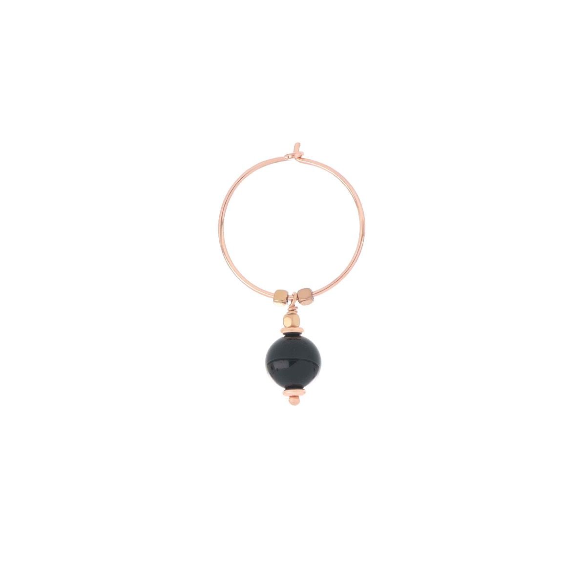 Il cerchio ha un diametro di 19 mm è realizzato in galvanica oro rosa e presenta sfere e cerchietti decorativi di ematite e una sfera pendente di Agata nera di 8 mm.
