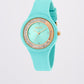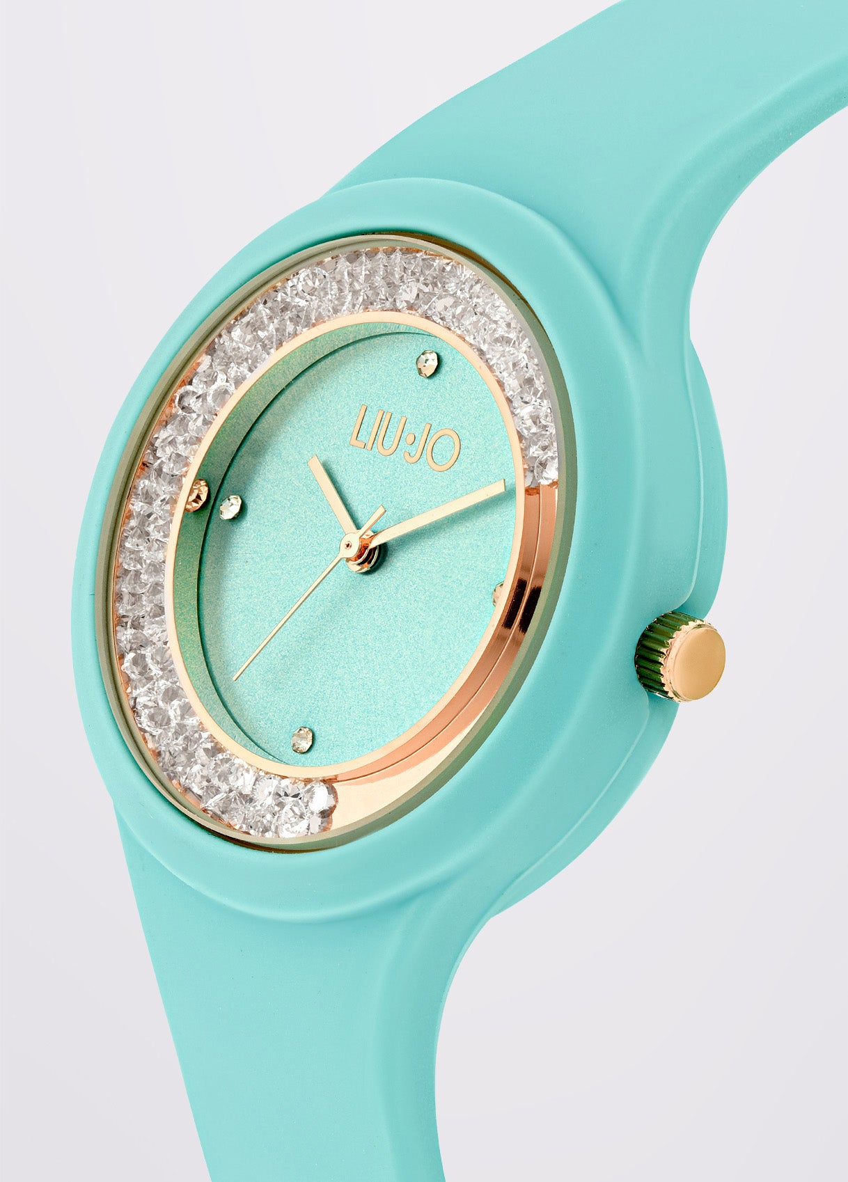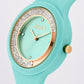 Orologio color turchese con pietre incastonate, quadrante su ton con brill applicati e cinturino in silicone con chiusura regolabile. Dettagli in contrasto color oro rosa. Diametro cassa: 3,7 cm. Resistente all'acqua fino a 5 atmosfere.