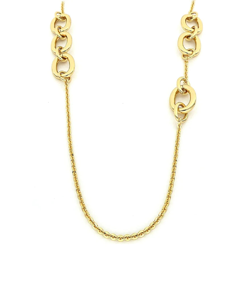 Collana lunga della collezione Unoaerre Fashion Jewellery Bronze da donna. Colore: oro. Il gioiello è in bronzo con catena forzatina piccola alternata ad elementi circolari grandi. Lunghezza 110 cm. Made in Italy. Tutti i gioielli in bronzo sono rivestiti con speciale trattamento al fine di garantire la durata del prodotto e l’inalterabilità.